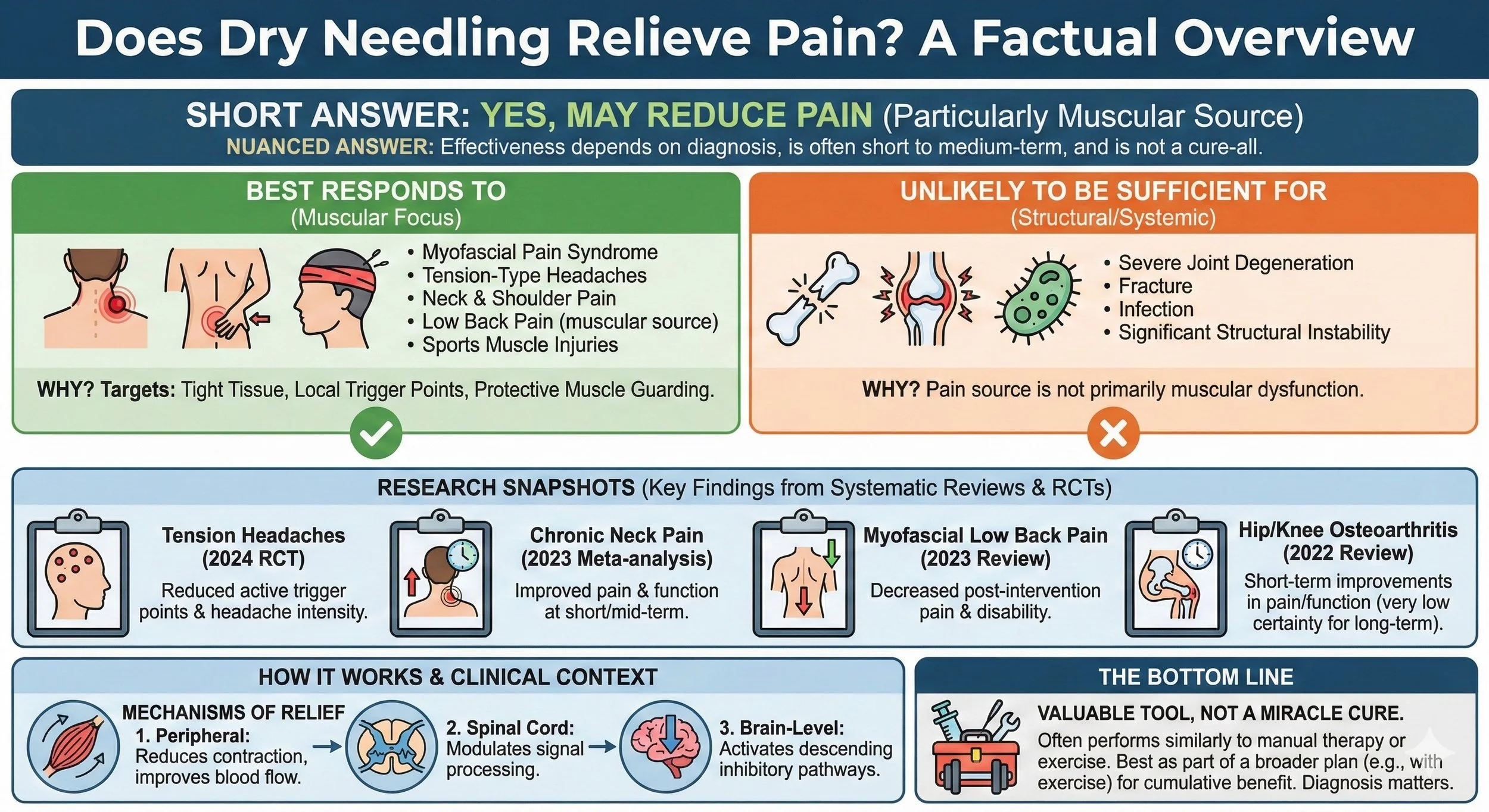 For chronic neck pain, a 2023 meta‑analysis of randomized clinical trials found that dry needling improved pain and functional capacity at short‑ and mid‑term follow‑up compared with several other interventions, with no serious adverse events reported.